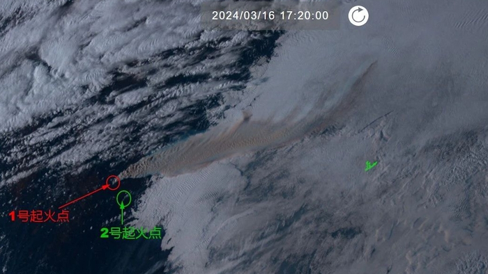 根据卫星图像来看第一起火点雅江县北部呷拉镇附近的森林大火最早出现在2024年3月16日16时以前,而第二起火点康定市西南甲根坝镇-沙德镇的森林大火最早出现在2024年3月16日17时20分左右。