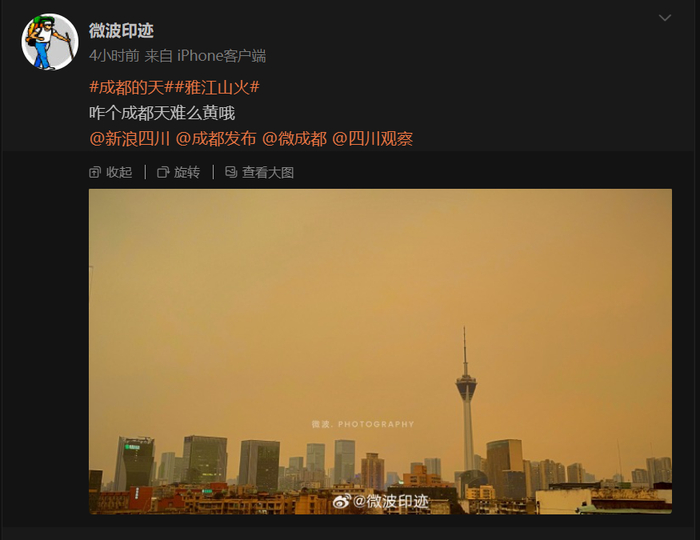 受3月16日下午四川甘孜州雅江县-康定西部森林山火影响,大量烟雾向东偏北方向飘散导致四川成都平原大部分地区天空变黄。